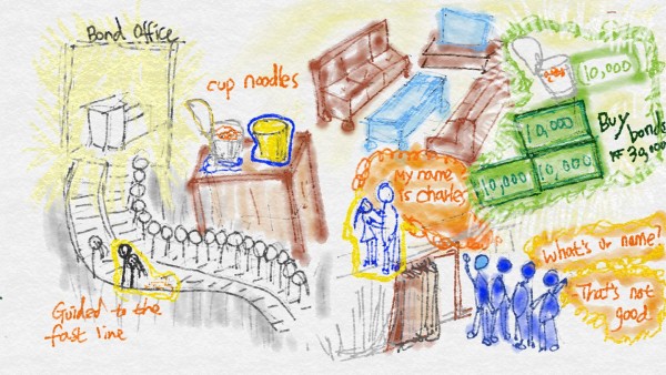 "Here, please exchange one unopened cup ramen for a gift certificate."
