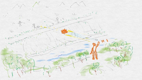 I suddenly throw a pine cone toward the rice paddies.