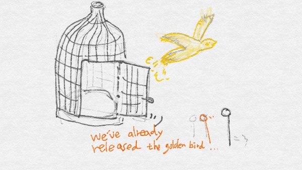 We were returning from freeing the golden bird from its cage in the other room.